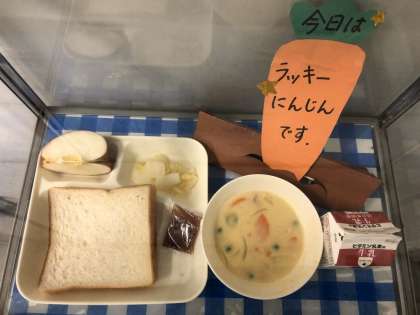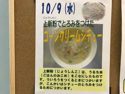 今日の給食は、コーンクリームシチュー(米粉)、はくさいのピクルス、りんご、食パン、いちごジャム、牛乳です。コーンクリームシチューは、小麦粉でルウを作らず、上新粉でとろみをつけています。上新粉はうるち米を粉にしたものです。充分にとろみがついていて、とてもおいしかったです。ラッキーにんじんも入っていて、どのクラスもよく食べていました。