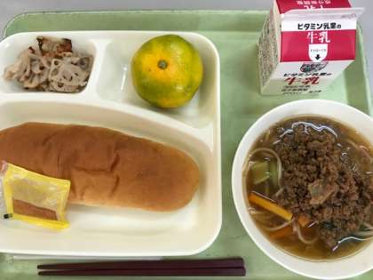 今日の給食は、タンタンめん、れんこんのオイスターソース焼き、みかん、コッペパン、アプリコットジャム、牛乳です。タンタンめんは、すりごまの風味のきいた汁めんの上にテンメンジャンなどで味付けした肉みそを盛り付けて食べます。みかんは、今年度初めての登場です。