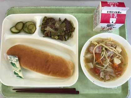 今日の給食は、牛肉のカレー風味焼き、トマトのスープスパゲッティ、きゅうりのピクルス、コッペパン、ソフトマーガリン、牛乳です。牛肉のカレー風味焼きは、2時間目ぐらいからカレーのおいしそうな香りが教室に入ってきて、子ども達は早く食べたいと心待ちにしていたようです。トマトのスープスパゲッティは、ほたての貝柱が入っていて、ほたてのうま味がスープによく出ていました。