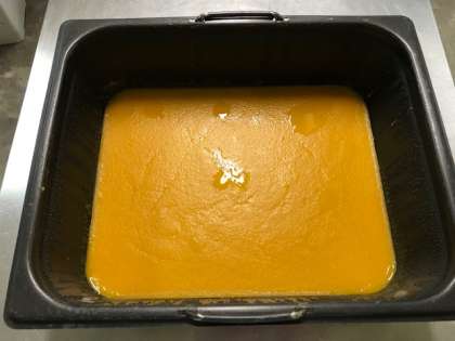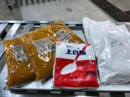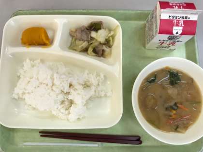 今日の給食は、豚肉とまいたけのいためもの、つみれ汁、かぼちゃういろう、ご飯、牛乳です。かぼちゃういろうは、手作りデザートです。かぼちゃのペーストと上新粉、砂糖、水を混ぜ合わせて、スチームコンベクションオーブンで30分間蒸しています。「黄色いういろうがめっちゃおいしかった!」「デザートが一番おいしかった!」「今日は全部食べられたよ。」など、うれしい感想をたくさん聞くことができました。