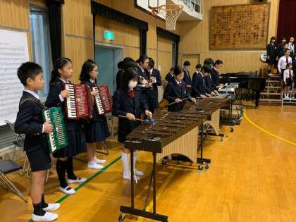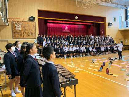 いよいよ音楽発表会まで2週間をきりました。今日の音楽朝会では、全校合唱の立ち位置を確認し、練習しました。本年度は、全校合唱の1番最後は、6年生による器楽合奏に合わせて二部合唱をします。初めての音合わせに、6年生はドキドキでしたが、歌声を支える気持ちよさを感じることができたようです。本番にむけ、全校児童気持ちを一つに演奏をつくりあげていきたいと思います。