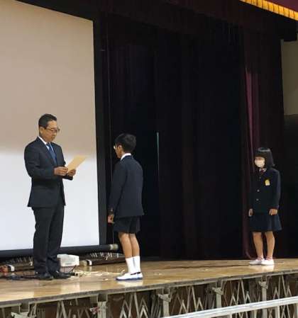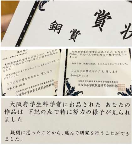 夏休みの理科の課題での頑張りから、大阪府学生科学賞を受賞したみなさんに賞状(銀賞、銅賞)が届きました。児童朝会でみんなで頑張りを共有しました。