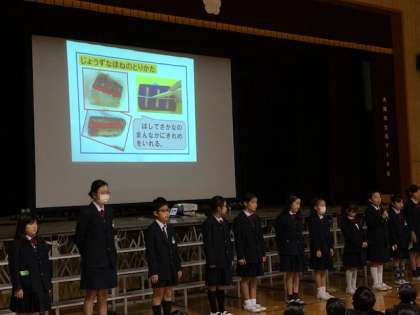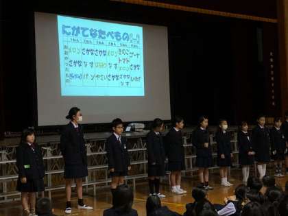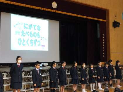 今週は、すこやか週間です。今月は、給食委員会から、給食に関する発表がありました。みんなの好きなメニュー、苦手なメニュー、苦手な人の多かった「さかなの骨の上手な取り方」、苦手なものを克服していくコツなど、みんながより給食を楽しく美味しく味わえるようにとの気持ちがとても伝わる発表でした。