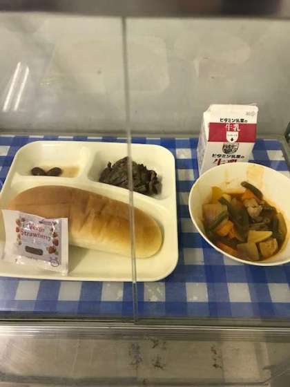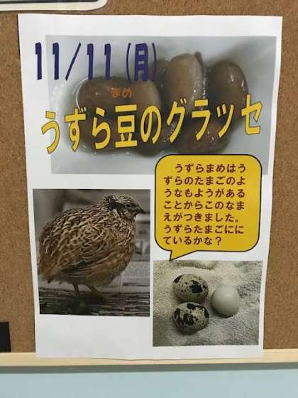 今日の給食は、牛肉の香味焼き、ケチャップ煮、うずら豆のグラッセ、コッペパン、いちごジャム、牛乳です。うずら豆は、うずらの卵のような模様があることからこの名前がつきました。グラッセとは、フランス語でバターを加えて煮つめ、ツヤを出した料理のことです。