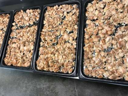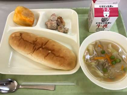 今日の給食は、鶏肉のガーリックマヨネーズ焼き、スープ、柿(富有柿)、おさつパン、牛乳です。ガーリックマヨネーズ焼きは、鶏肉ににんにく、塩、こしょう、マヨネーズで下味をつけて、スチームコンベクションオーブンで焼いています。柿は、富有柿と平核無柿が隔年で登場します。柿が苦手という子ども達が意外と多いことがわかりました。一口はがんばって食べていました。