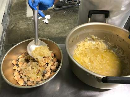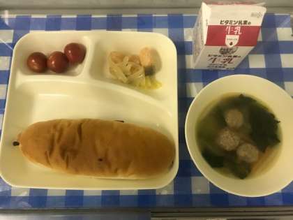今日の給食は、さけのマリネ、肉だんごと麦のスープ、プチトマト、レーズンパン、牛乳です。さけのマリネのマリネとは、魚や肉、野菜などを酢などから作る漬け汁に浸す料理のことです。スープに入っている押し麦は、大麦をつぶして平らにし、乾燥させたものです。食物繊維が豊富です。