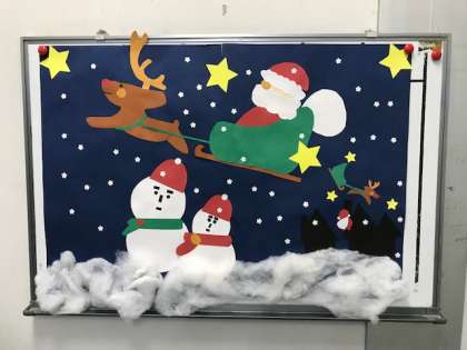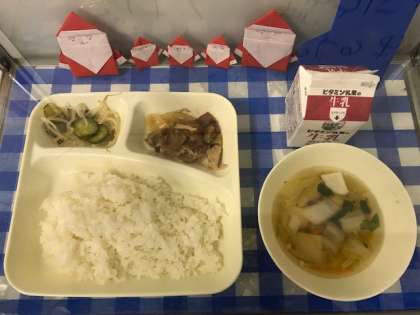 今日の給食は、焼き肉、五目汁、きゅうりともやしのおひたし、ご飯、牛乳です。12月になり、給食室の掲示がクリスマスに変わりました。かわいいサンタさんがたくさんいて、給食を取りにくる子ども達を見守っています。2学期の給食も残りわずかです。これからもおいしく味わいながら食べてほしいです。