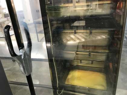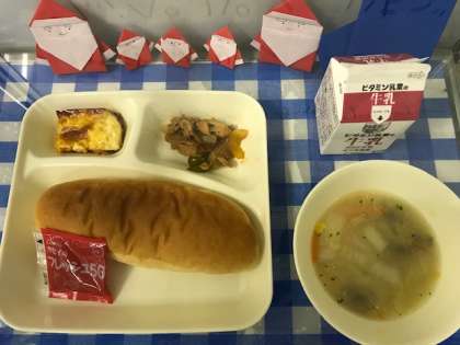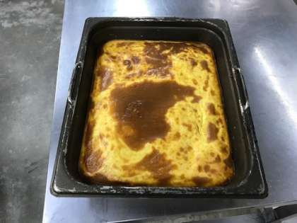 今日の給食は、豚肉のケチャップソテー、コーンスープ、焼きプリン、いちごジャム、コッペパン、牛乳です。焼きプリンは、手作りデザートです。卵とクリーム、砂糖を混ぜ合わせた卵液をカラメルソースを敷いたバットに入れて、180度のスチームコンベクションオーブンで25分間焼いています。