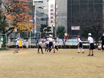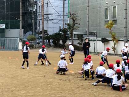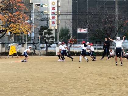 5年体育の学習では、タグラグビーに取り組んでいます。ルールを通して、チームプレイを大切に、みんなで協力してプレイしていくための身体の動かし方について考えて活動します。