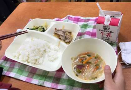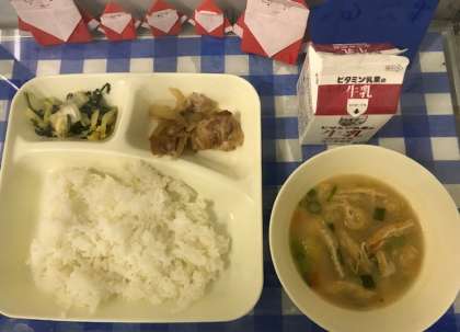 今日の給食は、豚肉のしょうが焼き、さつまいものみそ汁、きくなとはくさいのごまあえ、ご飯、牛乳です。今日のみそ汁のだしは、にぼしでとっています。さつまいもが入っているので、子ども達から「いつもよりあまいみそ汁や〜!」という声があがっていました。ごまあえのきくなは、大阪産のものを使っています。