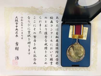 夏休みに取り組んだ「自転車盗難防止啓発絵画コンクール」で銀賞をいただいた児童の表彰を行いました。入賞作品は、中央区安全なまちづくり推進協議会発行の2020年カレンダーに掲載されます。日々の生活の中で気をつけるきっかけとなればと思います。