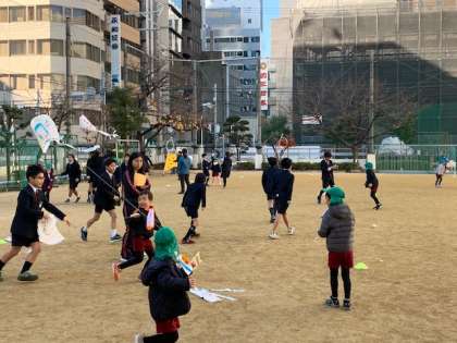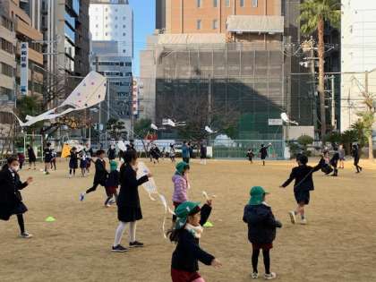 5年生が、愛珠幼稚園のみどり組さんと一緒にたこあげをして楽しみました。