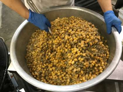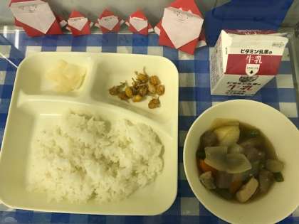 今日の給食は、鶏肉と野菜の煮もの、じゃこ豆、かぶのゆず風味、ご飯、牛乳です。じゃこ豆は、大豆を熱湯に60分間ひたし、片栗粉をまぶして油であげます。それを、砂糖じょうゆとちりめんじゃこ、いりごまと一緒に混ぜ合わせます。かみごたえのあるメニューです。