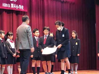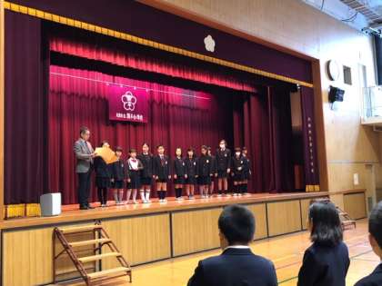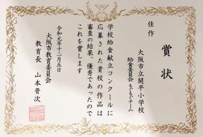 学校給食献立コンクールにおいて、給食委員会もぐもぐチームが佳作をいただきました。195点の応募から、4作が受賞。栄養のバランスや彩り、給食献立名を工夫しての受賞となりました。