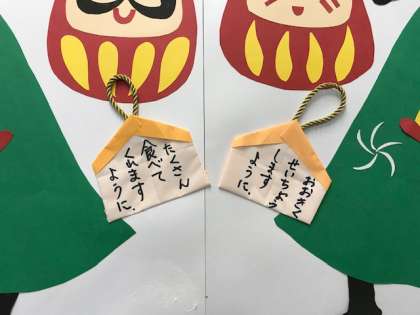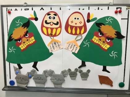 1月の給食室の掲示は、獅子舞やだるま、今年の干支のねずみなどです。絵馬に書いた通り、今年も給食をしっかり食べ、子ども達が健やかに成長してくれたらと思います。