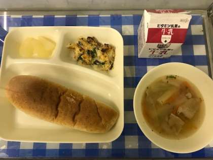 今日の給食は、マカロニグラタン、だいこんのスープ、和なし(缶)、ライ麦パン、牛乳です。マカロニグラタンは、子どもたちにいつも好評で、今回もとてもよく食べていました。