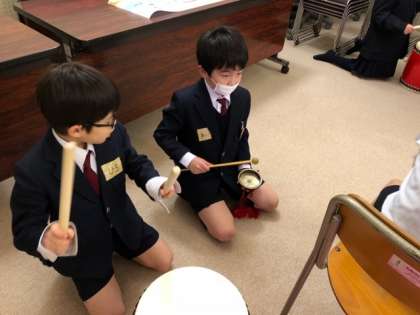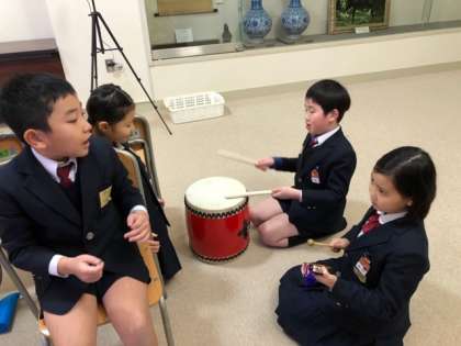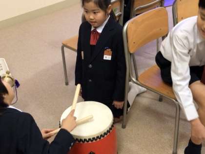 3年生では、天神祭船渡御で行われる「どんどこ船のお囃子」を教材とした学習に取り組みます。漕ぎ手、打ち手(太鼓・鉦)に分かれて、リズムに合わせて演奏します。
