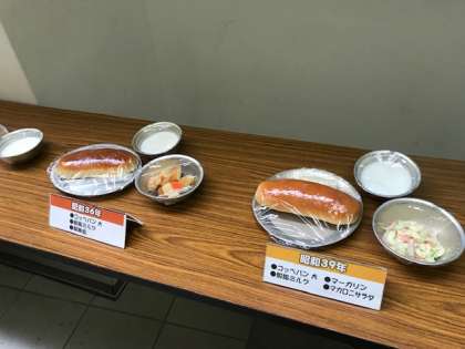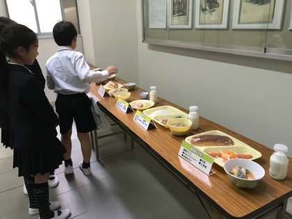 今週は、給食週間です。先週、給食委員会の児童が、大阪市の給食の歴史について委員会発表を行いました。同じ内容で、給食の移り変わりがわかるフードモデルを職員室前に展示しています。発表後に展示を見た児童は興味津々で、「これが脱脂粉乳なのかぁ」「昔の方が今よりパンが大きいなぁ。他のおかずがあまりなかったからかなぁ。」などと様々な感想を言いながら見ていました。22日(水)の参観日にも展示していますので、保護者の皆様もぜひご覧ください。