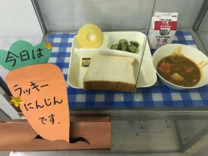 今日の給食は、ビーフシチュー、キャベツのバジル風味サラダ、パインアップル(缶詰)、食パン、バター、牛乳です。ビーフシチューにはラッキーにんじんが入っていました。