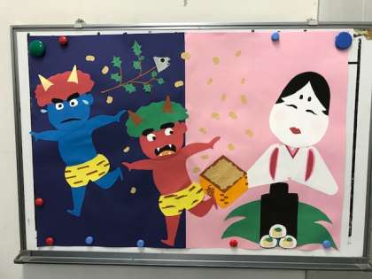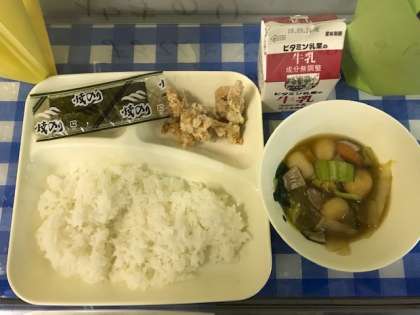 今日の給食は、鶏肉のからあげ、まる天と野菜のうま煮、焼きのり、ご飯、牛乳です。からあげは、子ども達に大人気のメニューです。まる天は、たらなどの白身魚のすり身から作ります。今日から2月の給食が始まりました。給食室の掲示も節分に変わりました。今日は節分です。給食では、5日に節分の行事献立が出ます。またご家庭でも、行事に込められた願いなどについてお話ししてあげてください。