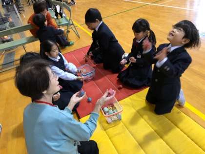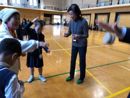 1年生活科の学習で、いろいろな昔遊びに親しみます。今日は、昔遊び名人の地域のみなさまから、コマまわし、ヨーヨー、お手玉など遊び方のコツを教えていただきました。