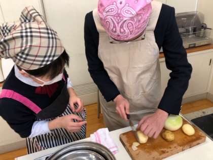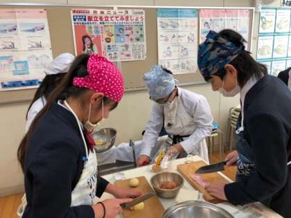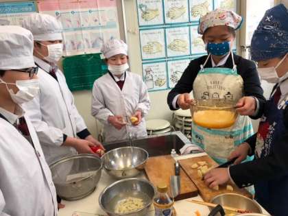 6年家庭科では、同じ食品でも、切り方や加熱の仕方、味のつけ方など調理の仕方によって、さまざまな料理をつくることができることを学んできました。今日の調理実習、メイン食材は「じゃがいも」と「たまご」。オムレツや茶碗蒸し、ジャーマンポテト、サンドウィッチ、フライドポテトなど、班によってさまざまな工夫を考えることができました。