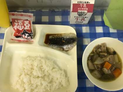 今日の給食は、いわしのしょうがじょうゆかけ、含め煮、いり大豆、ご飯、牛乳です。この献立は、節分の行事献立です。節分は2月3日でしたが、太巻きやいり大豆などを食べたご家庭もあったことと思います。骨を取るのに苦戦している人もいましたが、いわしのしょうがじょうゆかけの味つけがおいしいと、子ども達から好評でした。