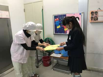 今日は、卒業を前にした6年生から給食調理員さんへ、手作りカレンダーのプレゼントがありました。「開平小学校の給食を食べるのも残りわずかですが、卒業までしっかりと味わいます。」というメッセージもありました。