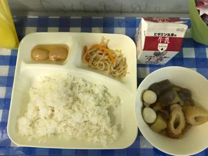 今日の給食は、関東煮、もやしとにんじんの甘酢あえ、白花豆の煮もの、ご飯、牛乳です。関東煮は、うずら卵の個別対応献立です。白花豆は、大阪市で使用する10種類の豆のうちの一つです。