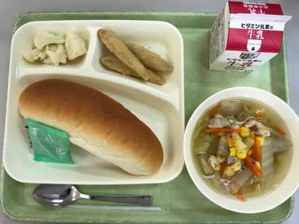 今日の給食は、わかさぎフライ、はくさいのスープ、カリフラワーのサラダ、コッペパン、いちごジャム、牛乳です。わかさぎフライは、油で揚げていて丸ごと食べられるので、子ども達にも食べやすかったようです。スープやサラダは野菜たっぷりで、風邪を防ぐビタミンなどの栄養素がたくさんとれる献立でした。