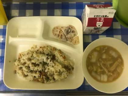 今日の給食は、鶏ごぼうご飯、みそ汁、焼きれんこん、牛乳です。鶏ごぼうご飯は、鶏ひき肉やごぼう、にんじんなどの具をいため、炊きたてのご飯と混ぜ合わせた混ぜご飯です。焼きれんこんは、塩と油で下味をつけ、オーブンで焼いています。今日の献立は、子ども達にとって大満足だったようで、どのクラスの食缶もからっぽでした。「2回もおかわりした。」「おかわりに10人ぐらい並んでた。」など、たくさん伝えてくれました。
