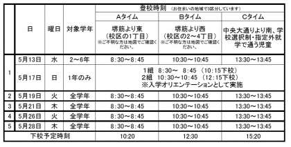 1か所に集まる人数を減らすため、お住まいの地域にもとづいて3つに分けて実施します。表のご確認の上、その登校時間に登校させてください。