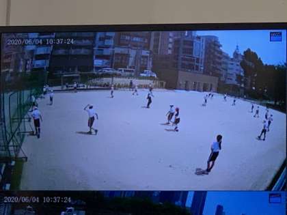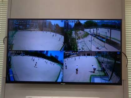 第2運動場での様子は、職員室のモニターからリアルタイムで見守ることが出来ます。今は、4年生が体育の学習をしています。