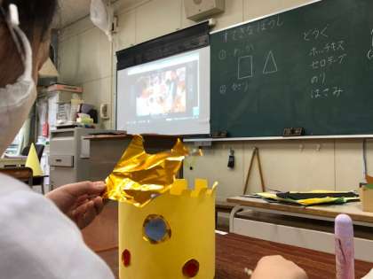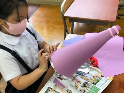 2年図工「すてきなぼうし」の学習では、平面から立体をつくっていきます。輪っかの形を工夫し、飾り付けをしていきました。さらに、飾りの形や彩り、組み合わせを工夫し、すてきなぼうしが出来上がってきています。