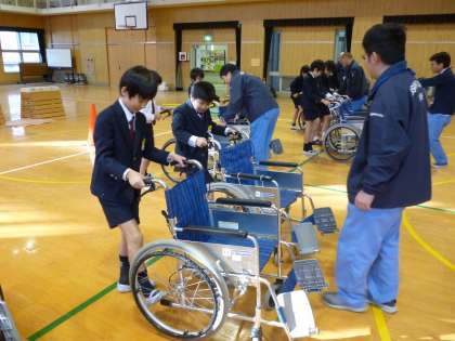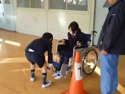11月27日(木)に、大阪市リハビリテーションセンターの方に来校していただき、3年生が車いす体験を行いました。子どもたちは車いすの仕組みや押し方、乗り方の説明を受け、実際に乗ってコースを回る体験をしました。少しの段差があるだけで大きく揺れたり、力をいれないと乗り越えられなかったりと、車いすを使って生活している人たちの身になって感じ考えることができました。人権・福祉について学習していくよい機会となりました。