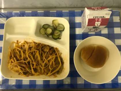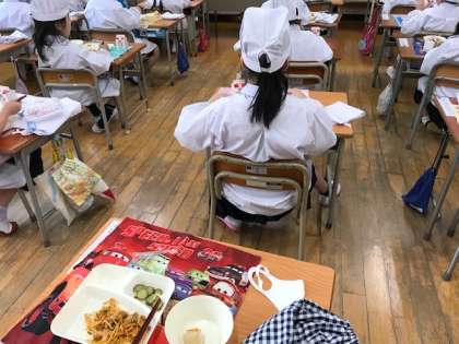 6月1日からパン、牛乳、副食1品という給食が始まりました。今日からは、全員そろった教室で、通常通りの給食に戻りました。今日の給食は、スパゲッティミートソース、きゅうりのピクルス、黒糖パン(半)、牛乳です。久しぶりの通常給食に「おいしい!」と言って、どのクラスの子ども達もおかわりをする姿が見られました。1年生も上手にお箸を使い、最後まできれいに食べていました。給食室で明日のメニューを見た児童が、「やったー。明日はご飯や。」と喜んでいました。分散登校中は毎日パンだったので、給食にご飯が出ることがうれしいようでした。