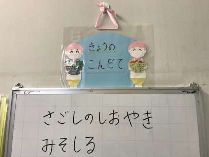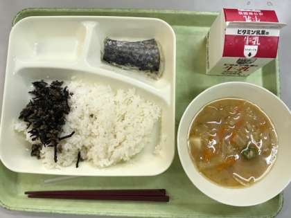 今日の給食は、さごしの塩焼き、みそ汁、牛ひじきそぼろ、ご飯、牛乳です。さごしは、さわらの小さい時の呼び名です。切身で骨がそんなにあるわけではないのに、魚というだけで「苦手!」と表情が暗くなっている子ども達がいました。牛ひじきそぼろは、初めて食べた1年生が表現すると、「大人の味」だそうです。
