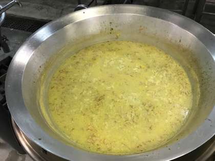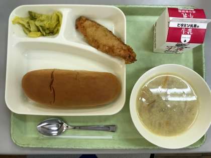 今日の給食は、サーモンフライ、豆乳スープ、キャベツのカレーソテー、黒糖パン、牛乳です。サーモンフライは、サクサクでカラッと揚がっていて、とてもおいしかったです。給食を取りにきた時に6年生から一言、「僕、学校の中で給食時間が1番好きやわ!」、給食を食べている時に1年生から一言、「今日の給食、2階、3階を超えて空まで行って、宇宙まで行くぐらいおいしい!」と、大好評でした。