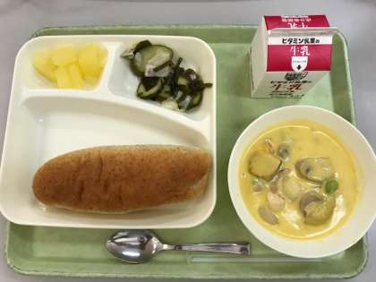 今日の給食は、かぼちゃのクリームシチュー、ミックス海そうのサラダ、りんご(缶)、ライ麦パン、牛乳です。子ども達は、かぼちゃのクリームシチューをそのまま食べたり、小さくちぎったパンをつけて食べたり、いろいろな食べ方をしていました。ミックス海そうのサラダは、4種類の海そうが入ったサラダです。