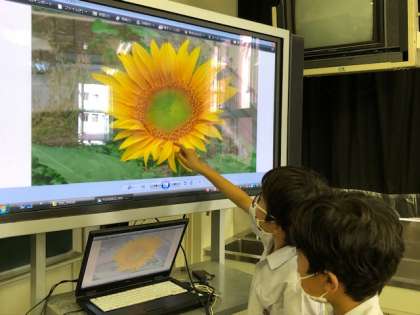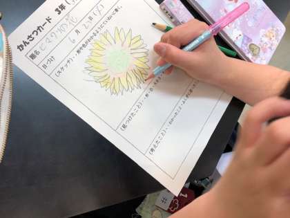 3年理科の学習では、大きく育ったひまわりの観察をしました。1年生の時とは異なり、細かな部分まで、しっかり観察する姿がみられました。