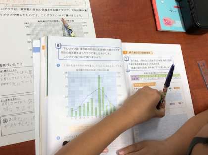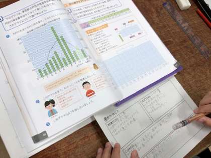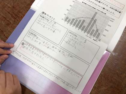 今日の4年算数では、棒グラフと折れ線グラフを比べ、それぞれのグラフのよさについて考えました。「たての軸のめもりを左と右にとると、2つのことを1つであらわすことができるんだな」「折れ線グラフをかくには、めもりをきちんとみてつなげていかないといけないな」と気付きを踏まえ、自分で折れ線グラフを丁寧にかいていくことができました。