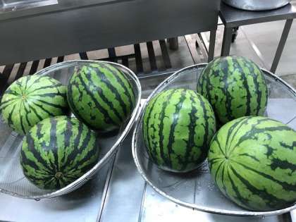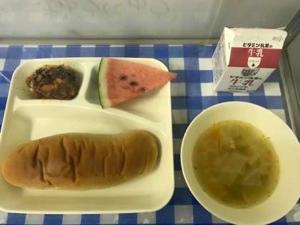今日の給食は、かぼちゃのミートグラタン、スープ、すいか、黒糖パン、牛乳です。ミートグラタンは、夏が旬のかぼちゃが入っていて、かぼちゃの甘みを感じました。すいかは、大きなすいかが6個学校に配達されました。
