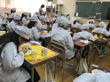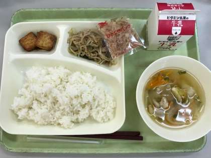 今日の給食は、ゴーヤチャンプルー、すまし汁、あつあげのしょうがじょうゆかけ、ご飯、牛乳です。ゴーヤチャンプルーのゴーヤは、にがうりとも呼ばれ、苦味があって苦手な人も多い野菜です。給食室で調理する時は、なるべく薄くスライスして、塩でもんで食べやすくしています。