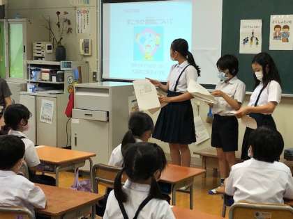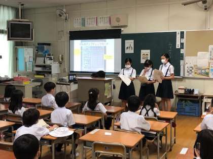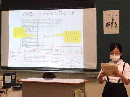 今日は、放送朝会で保健委員会からのお知らせのあと、初めて取り組む1年生には、保健委員会の6年生が説明にいきました。毎日、「げんきアップチェックカード」に、体温や生活の様子を振り返り記入します。週末には、保護者の皆様から子どもたちの取り組みへのコメントをいただきたいと思います。1週間一緒に取り組んでいただければと思います。