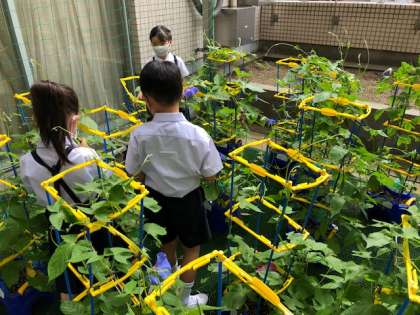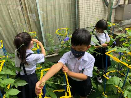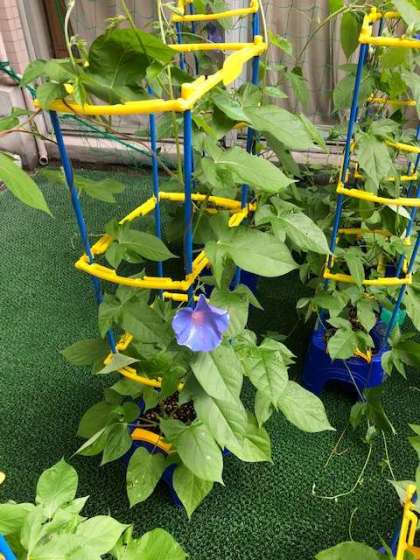 1年生が生活科の学習で育てているあさがおがたくさん花を咲かせています。「つるがすごくのびてきた!毎日、お世話をしっかりしなきゃ」「今日もまた、新しい色のあさがおがさいた!」と毎日しっかりお世話・観察を続けています。