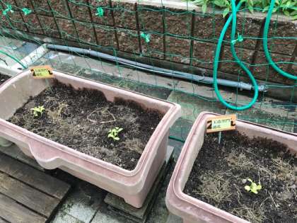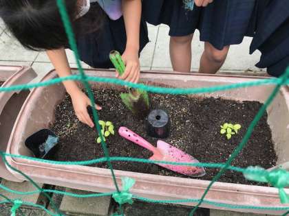 苗用ポットから苗を取り出し、掘った穴の中に植えます。苗に直接土がかからないように、苗をつかんでしまわないように気をつけました。ここから、本葉がどんどん大きく育ち、何枚にも増え、つるが伸びて実がつくのが楽しみです。実がついたら、おいしい調理法なども考えたいと思っています。
