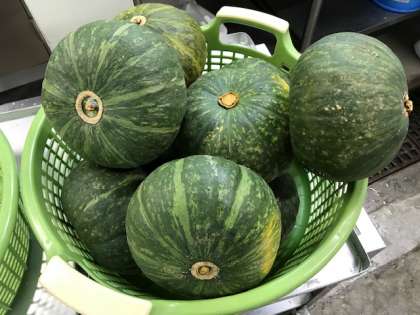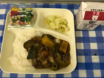 今日の給食は、夏野菜のカレーライス、キャベツのサラダ、豆こんぶ、牛乳です。夏野菜のカレーライスには、かぼちゃやなす、ピーマン、トマトなど、夏が旬の野菜が使われています。