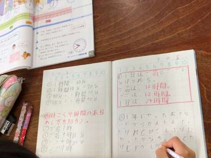 2年生算数では、1年生「なんじ なんじはん」の学習を踏まえ、午前・午後のくくりについて学習します。学習のふりかえりでは、前の学習とのつながりをしっかりと感じ、さらに何が身についたかをふりかえる姿がみられました。
