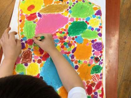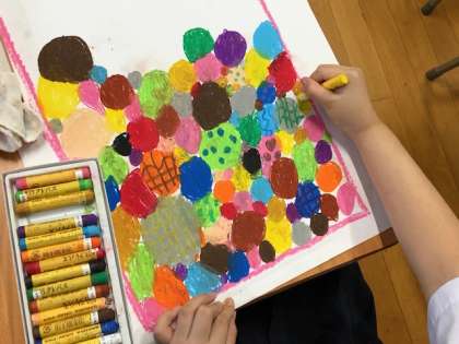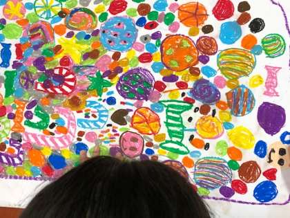 1年図工では、パスを使って描く学習をします。今回の課題は「まほうのこびんをキャンディーでいっぱいにしよう」。パスの使い方である「?しっかり濃く塗りこむ」「?隙間なく塗る」「?パスの先をガーゼで拭いて、色が混ざらないように塗る」を意識して、まほうのこびんにカラフルなキャンディーをたくさん詰めていきました。