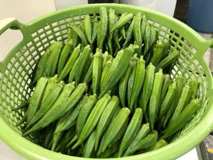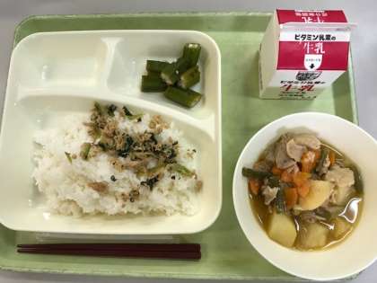 今日の給食は、豚肉とじゃがいもの煮もの、オクラの梅風味、ツナっ葉いため、ご飯、牛乳です。オクラは夏が旬の食べ物です。梅肉の酸味でさっぱりと食べやすくしています。ツナっ葉いためは、ツナとだいこん葉をいためて、ふりかけのようにしています。ご飯が進む一品です。今日は全クラス、とてもよく食べていました。